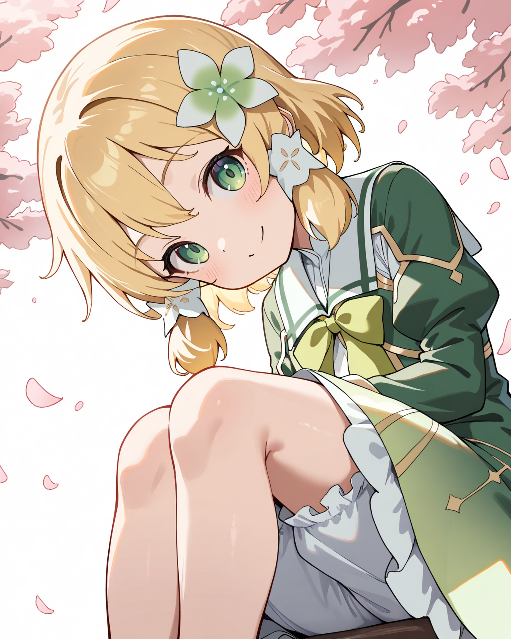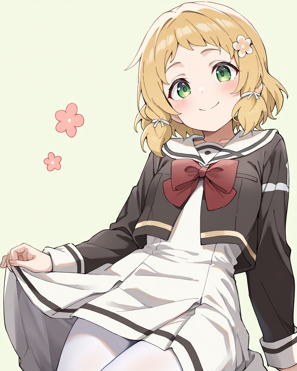 カジュアルウェア:1人女の子、単体、短髪、緑色の目、髪の花、金髪、スカート、髪飾り、ヘアクリップ、リボン、ドレス、学ラン、パントストッキング、赤いネクタイ、白いドレス、