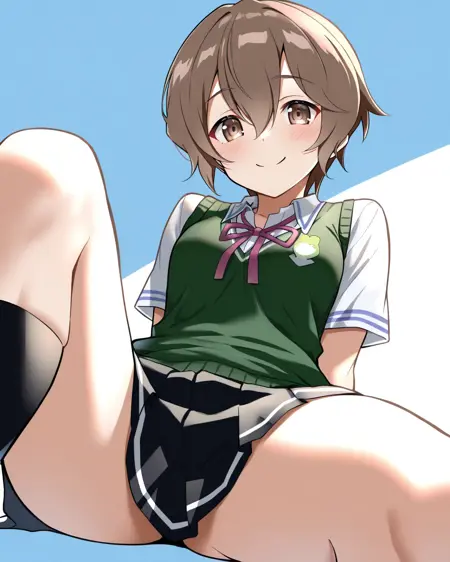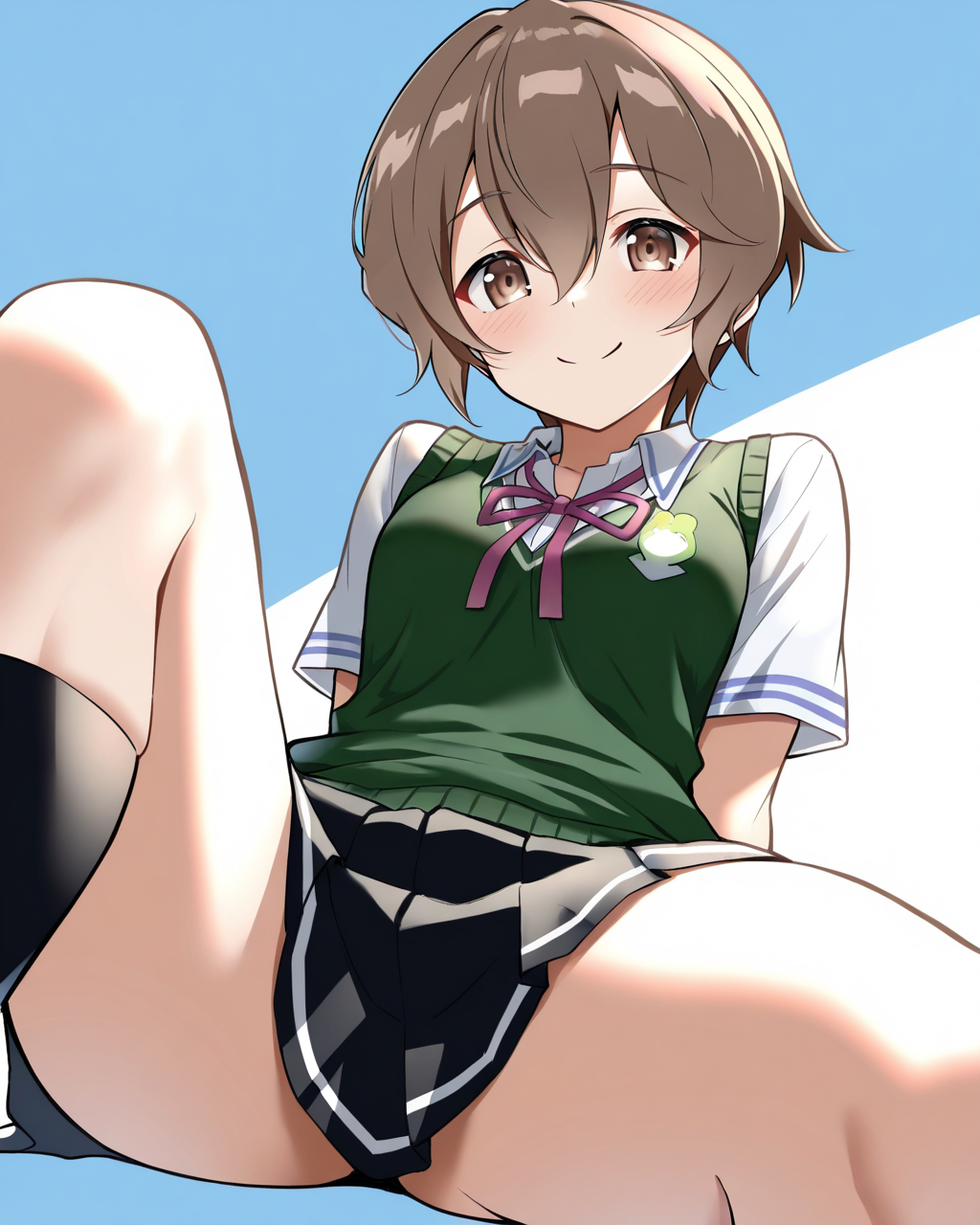 uniform : fujimori mito,1girl, solo, short hair,brown hair, brown eyes,between eyes, school uniform,white shirt,ribbon, pleated skirt, green sweater vest,neck ribbon,