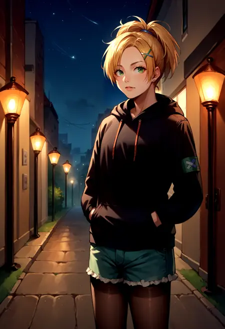 RikkuX, x hair ornament, goggles around neck, fingerless gloves, midriff, navel, belt, bootsX2Outfit: