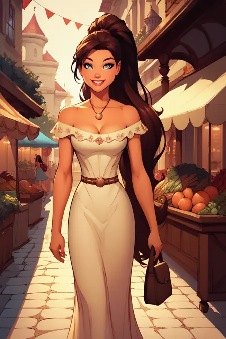 Trigger : 1girl, very long hair, ponytail, necklace, joints, cleavage, bare shoulders, off shoulder, dress