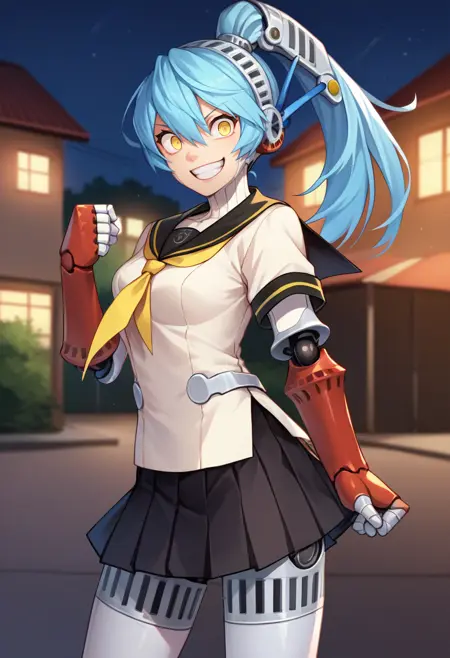 Trigger + Appearance: p4labrys, android, robot joints, blue hair, ponytail, red eyes