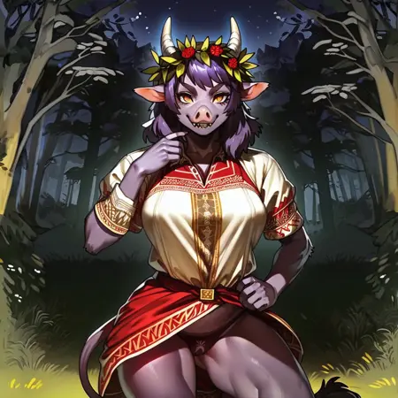 강화 태그: 송곳니, 날카로운 이빨, 진한 보라색 털, 말의 형태, 진한 회색 돼지 코, 뿔, 꼬리,**
