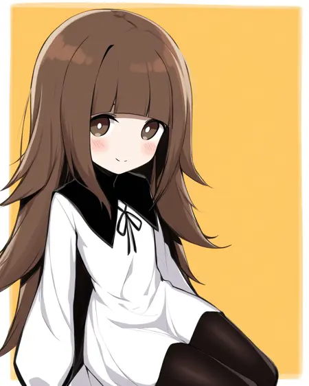 1girl, solo,deemo aris, long hair,blush,brown hair, long sleeves, brown eyes, blunt bangs, white dress,black pantyhose,neck ribbon,