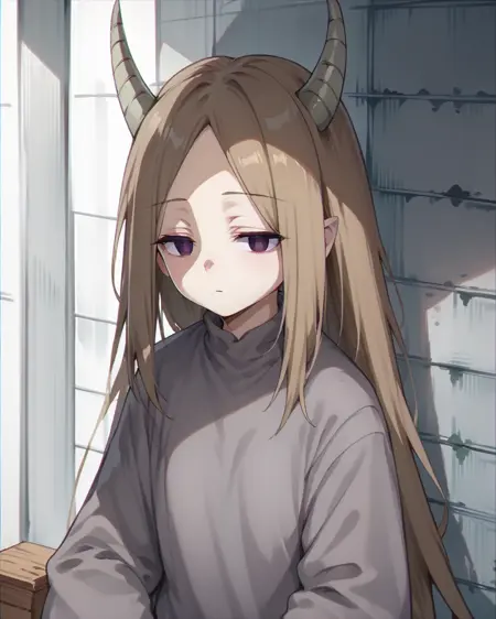 demon girl,1girl, horns, solo,very long hair,empty eyes, purple eyes, grey shirt,brown hair,demon girl, long sleeves,jitome,