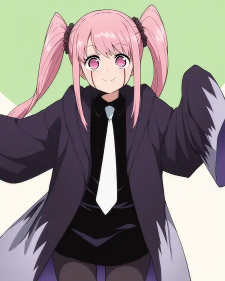 喜爱可爱的,1个女孩,单独,粉红色头发,双马尾,长发,粉红色眼睛,裙子,黑色连裤袜,白色领结,袖子过手指,乐福鞋,长袍,袖子过手腕