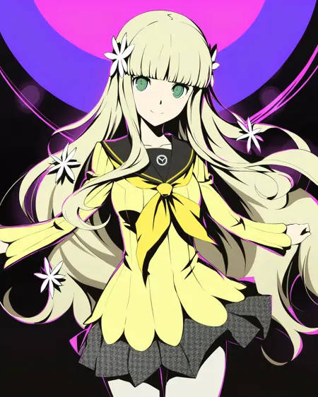 人物Q雷,1个女孩,单独,长发,绿眼睛,齐刘海,花朵,金发,发饰,发花,八神学园制服,校服,裙子,水手服,丝袜