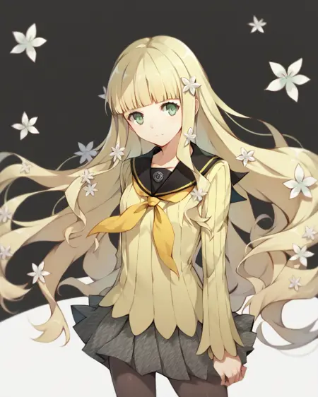 persona q rei,1girl, solo,very long hair, green eyes,blunt bangs,flower,blonde hair, hair ornament, hair flower, yasogami school uniform, school uniform, skirt, serafuku, pantyhose,