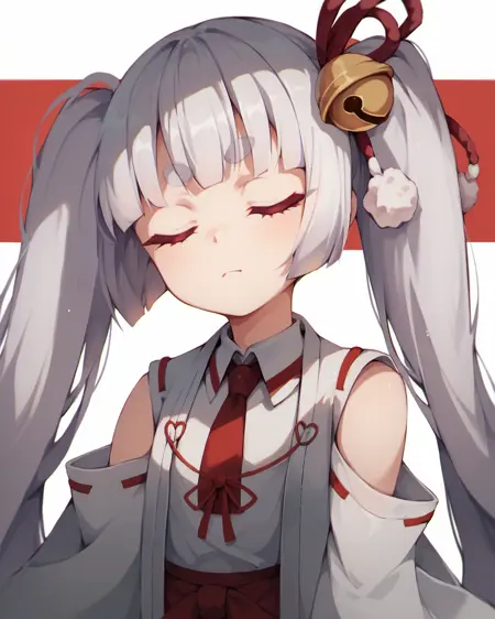 犬走椛,1个女孩,单独,闭眼,红眼,长发,双马尾,白发,发饰,刘海,浓眉,发饰铃,铃铛,脱袖,和服,神社巫女,领结