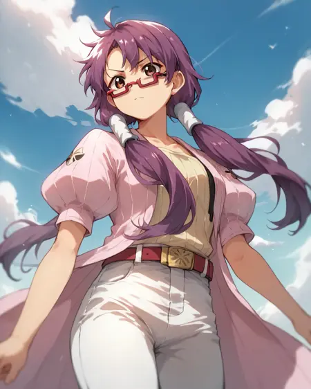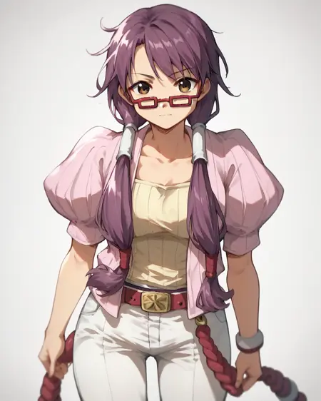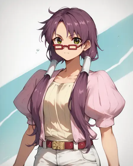 1个女孩,单独,铃子·杰拉德,紫色头发,长发,双马尾,发管,棕色眼睛,红色眼镜,腰带,双马尾,白色裤子,衬衫,蓬松袖子,