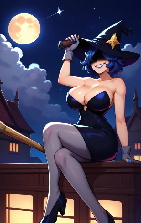 Prompt character: CordeliaSDXL, 1girl, solo, breasts, short hair, large breasts, gloves, hat, dress, cleavage, bare shoulders, blue hair, collarbone, off shoulder, black dress, black headwear, makeup, witch hat, lipstick, blue nails, off-shoulder dress, covered eyes, blue lips,