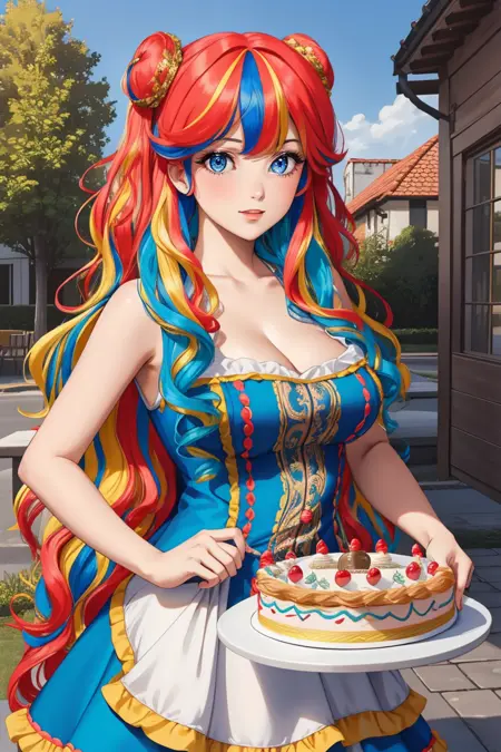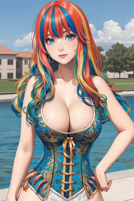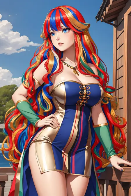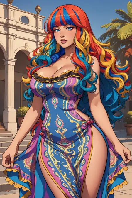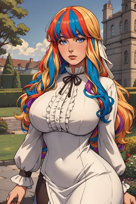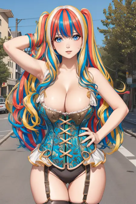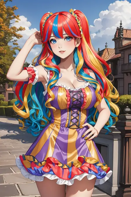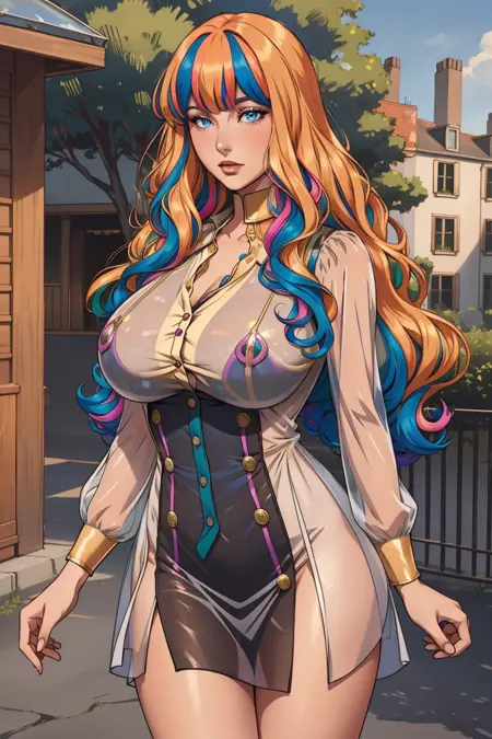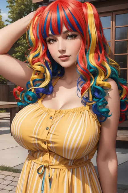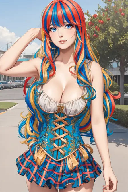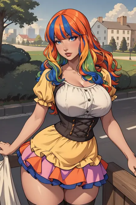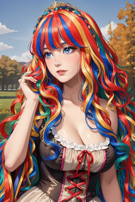 or HUD_Rbw_Wg, multicolored wig, bangs (makes wig brighter but may bleed over into clothing) but I would use this phrase at .55 strength and see if it works