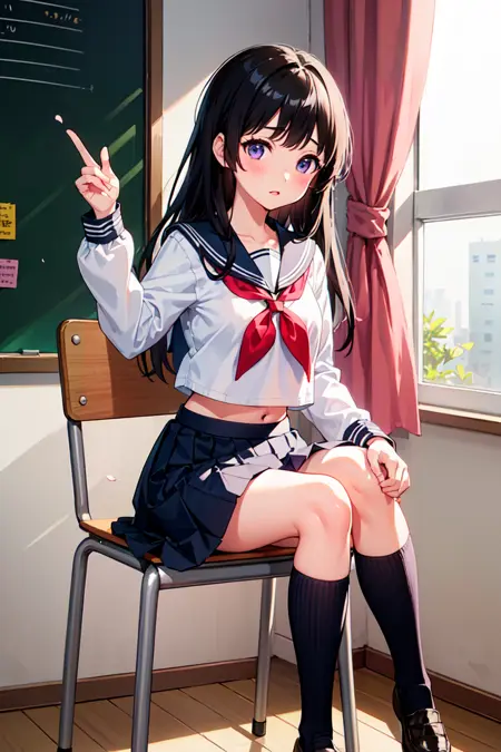 彼女を呼び出すには、以下のタグを使用してください:千手庵 絵留、黒髪、ロングヘア、紫色の目、赤ら顔、三分縞制服、前髪、スカート、神山高校の制服(ひょうか)