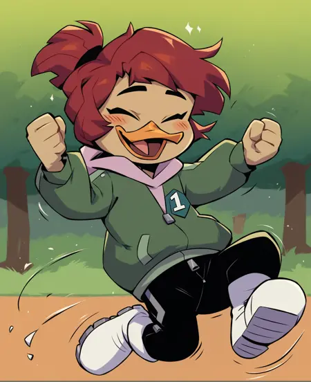 gosalyn waddlemeyer, red hair, green eyes, ponytail, duck, beak, ducktales, eyebrows, scut tail, short tail, eyeliner, light brown skin,