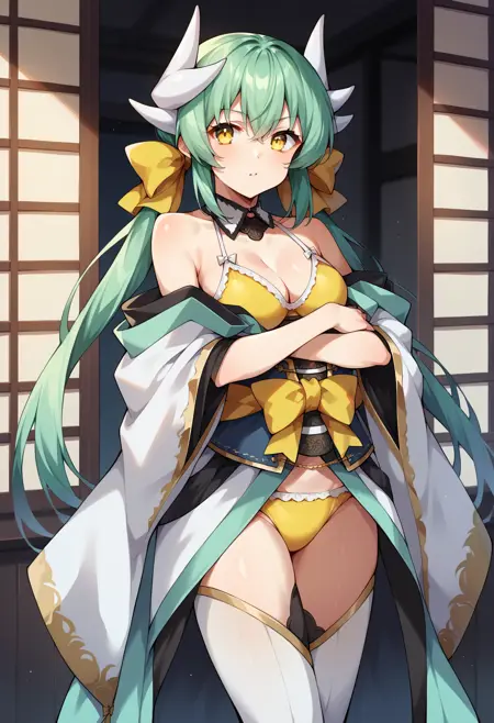 outfit1aakiyo, long hair, green hair, white horns, hair bow, yellow bow, yellow eyes, detached collar, bare shoulders, off shoulder, yellow bikini, japanese clothes, kimono, sash, obi, white thighhighs