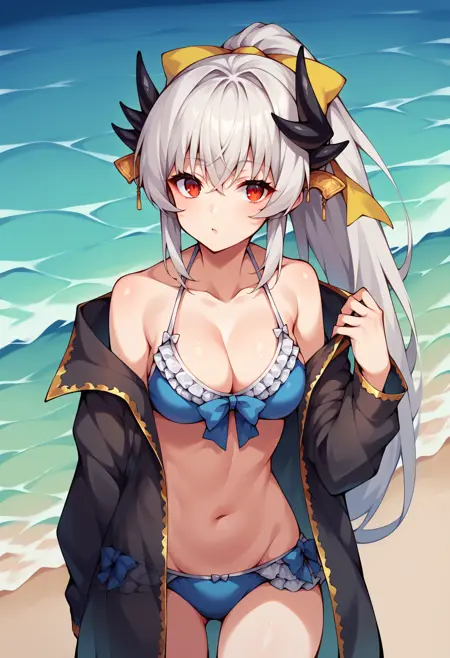 outfit3cckiyo, long hair, white hair, ponytail, black horns, hair bow, hair ornament, yellow bow, red eyes, collarbone, bare shoulders, cleavage, frilled bikini, blue bikini, off shoulder, black jacket, open clothes