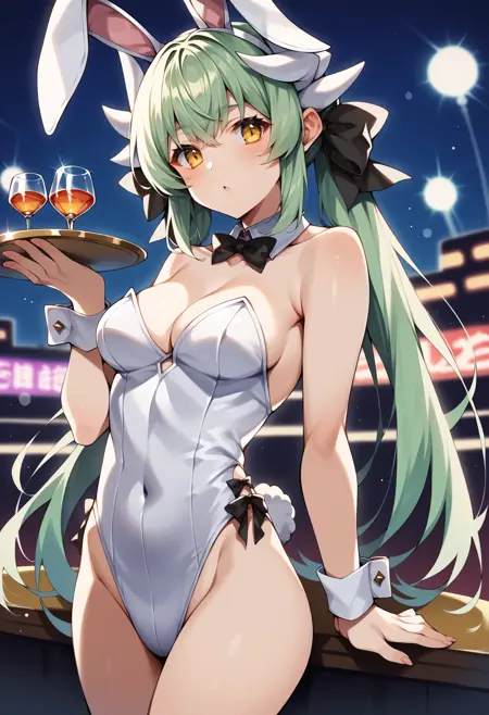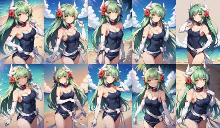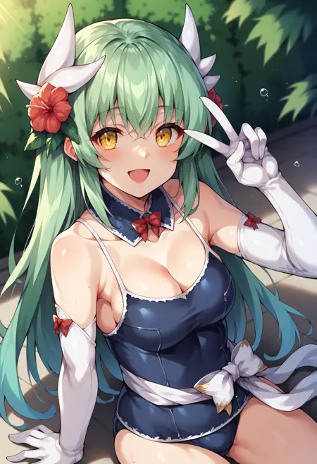 outfit2bbkiyo, long hair, green hair, white horns, hair flower, yellow eyes, detached collar, cleavage, school swimsuit, blue one-piece swimsuit, elbow gloves, white gloves, sash