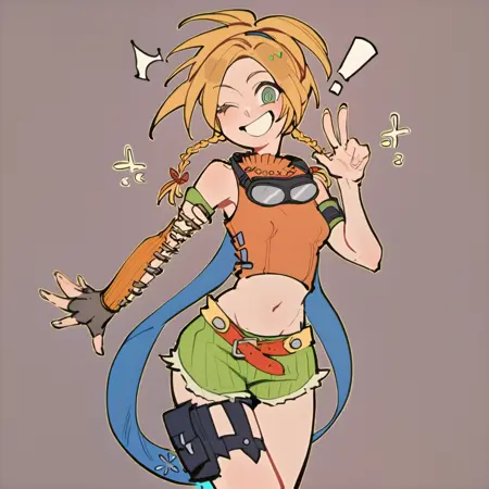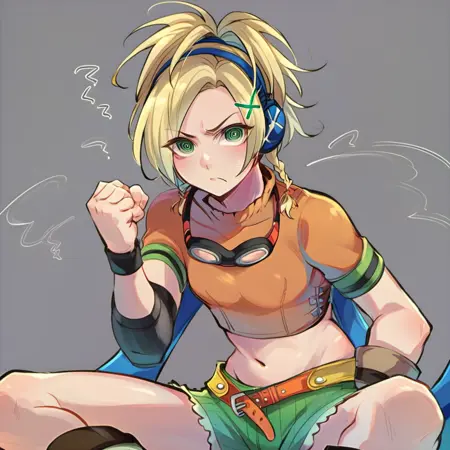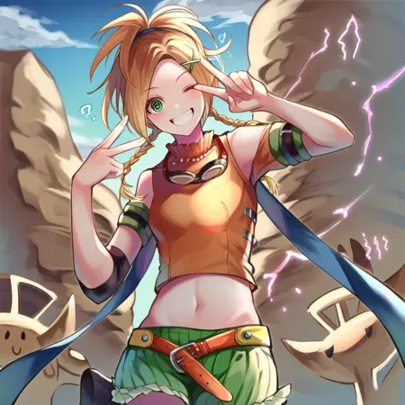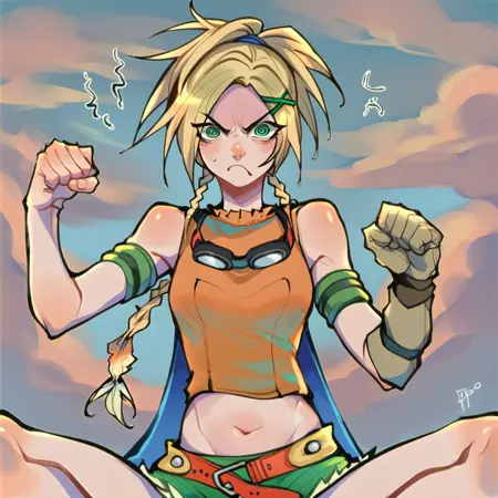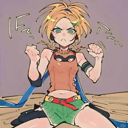 first version, needs to be thourough in prompting her, rikku \(ff10\), @_@, green shorts, orange shirt should be enough.