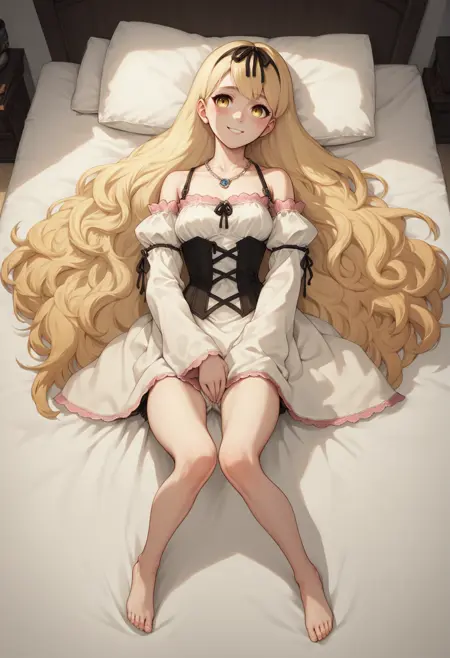 Notable tags: blonde hair, yellow eyes, ribbon, necklace, jewelry, dress, long skirt, corset, wide sleeves, long sleeves