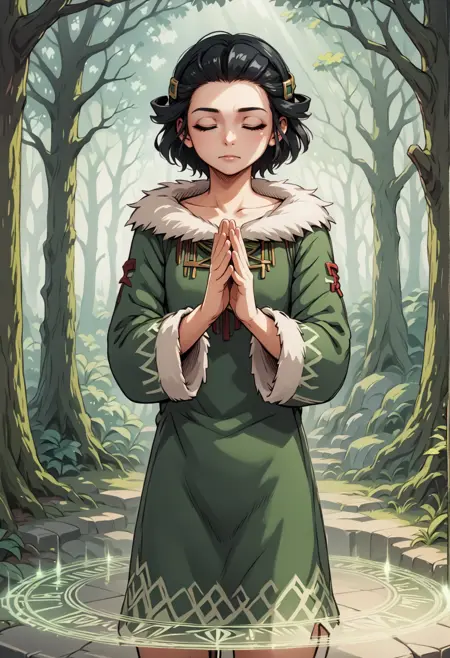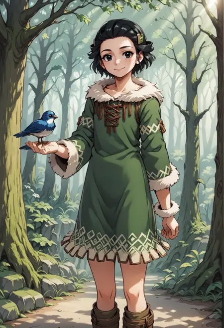 검은 눈, 검은 머리, 단발, 머리 장신구, 이마, 짧은 드레스, 긴 소매, 모피 장식, 부츠