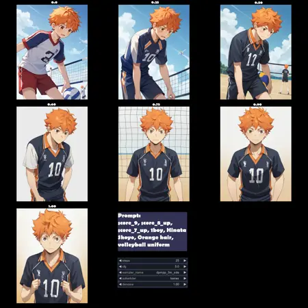 このLoRAはPonyで学習されました。プロンプトは他の場合と同様で、オプションのトリガーとして「Hinata Shoyo, orange hair, volleyball uniform」を使用できます。最初の二つを推奨します。「1boy, male」も使用すると良いですが、必須ではありません。