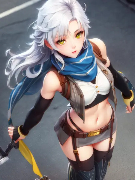 添加“长发”、“灰色背心”、“蓝色围巾”、“白色吊带上衣”、“灰色迷你裙”、“黑色长筒靴”和“吊袜带”以获得她的《闪之轨迹III》造型。