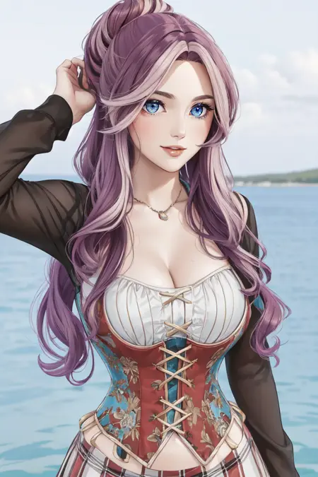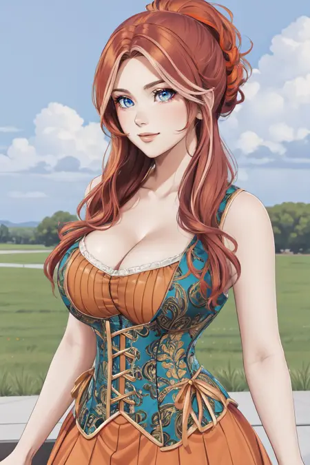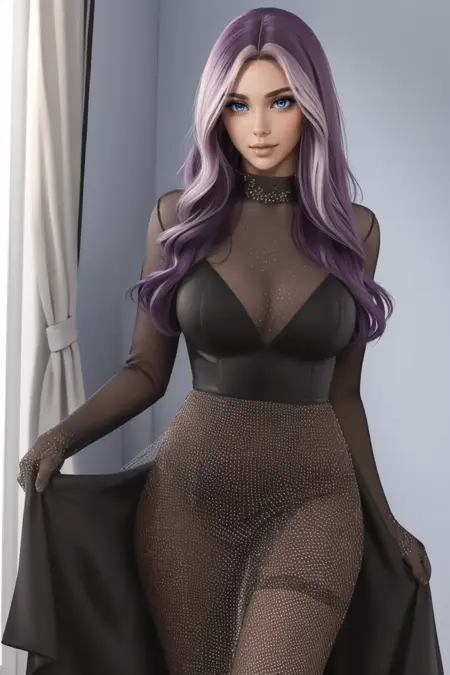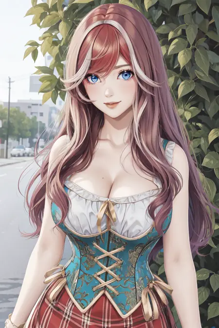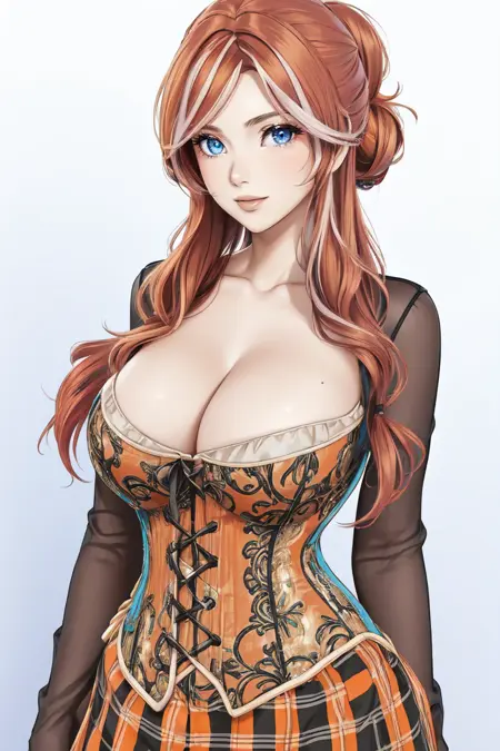 This wig works differently depending on your model. If you see a dark area around the forehead (the roots on the wig were a bit dark), adding "updo" to your prompt can help