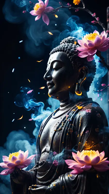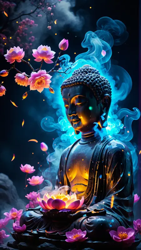 AiARTiST,Chinese Buddhism,Tathagata face ,Suspended glowing flowers and petals,lots of smoke,neon light,Starry sky background,lora:AiARTiST\_Tathagata:1