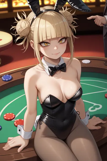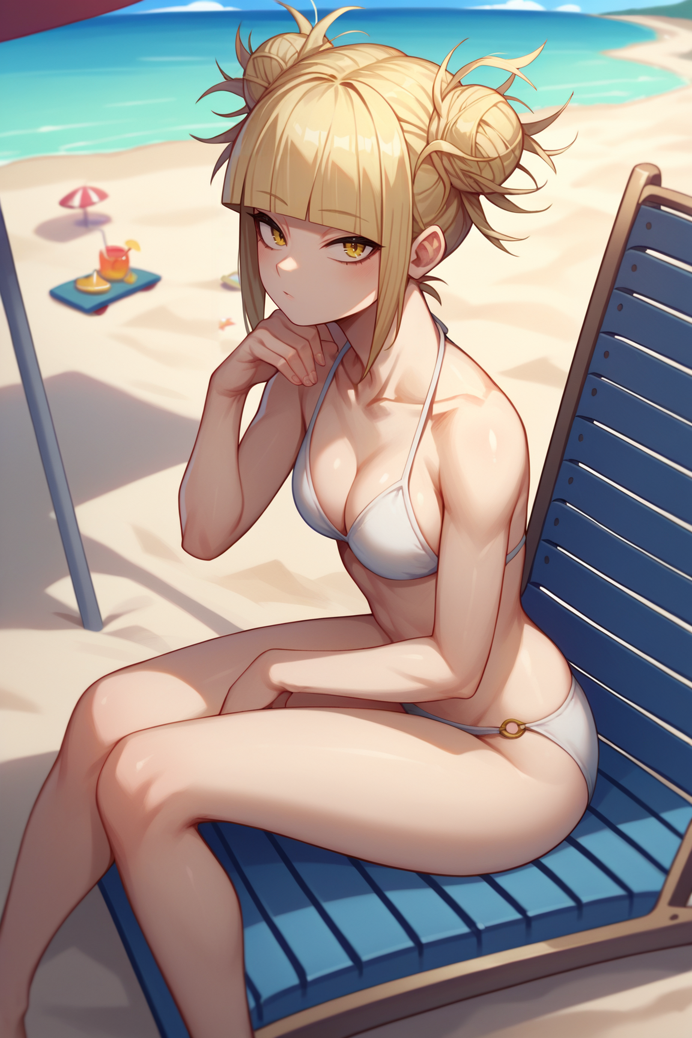 Description: yellow eyes, slit pupils, narrowed eyes, blonde hair, hair bun, double bun, messy hair, blunt bangs, sidelocks