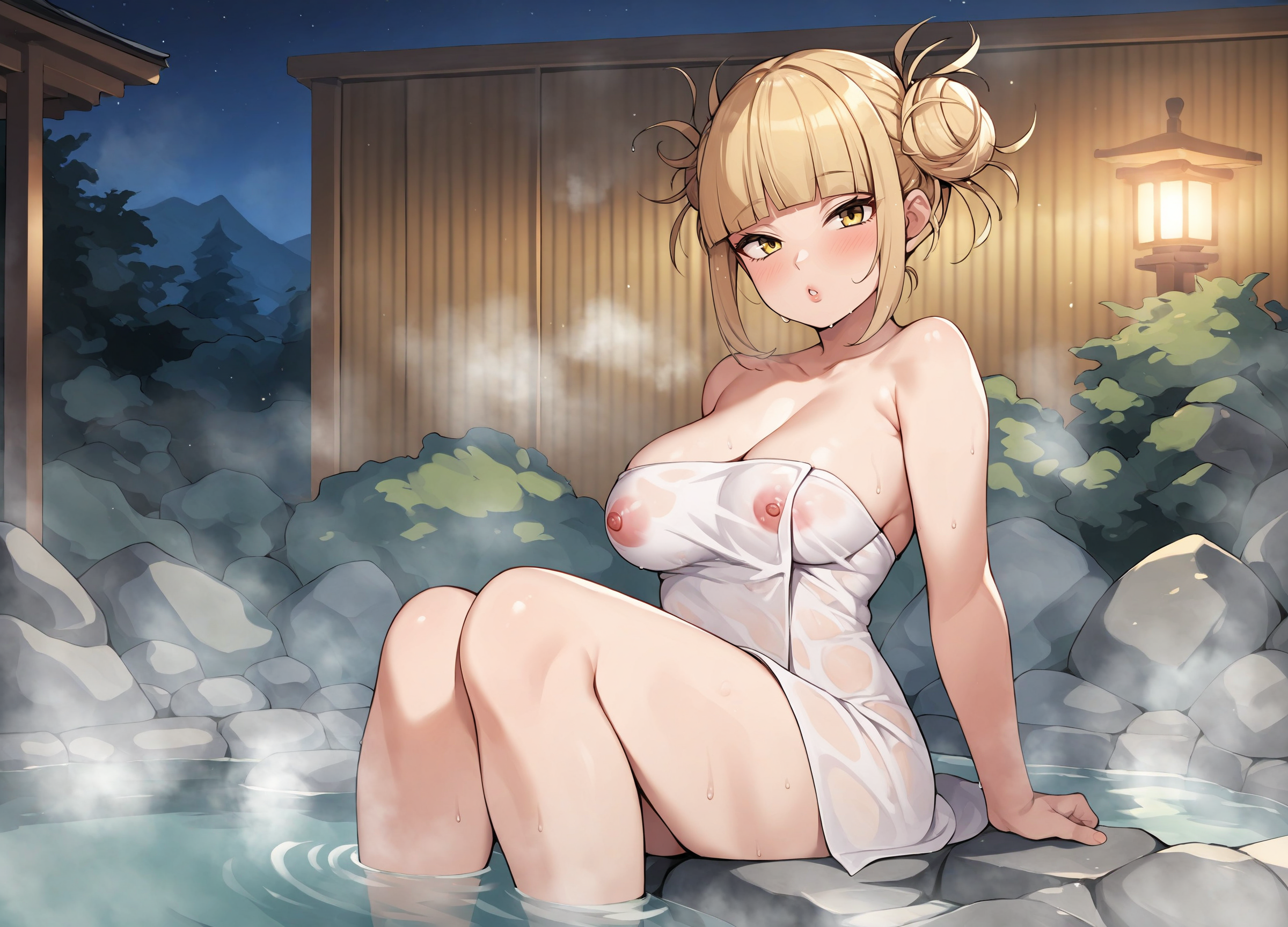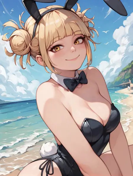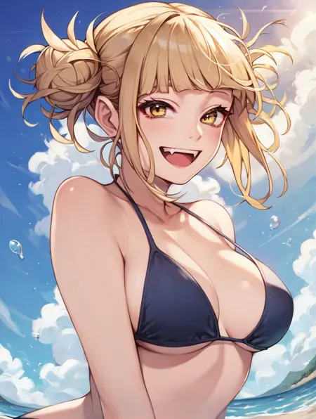 Description: yellow eyes, slit pupils, narrowed eyes, blonde hair, hair bun, double bun, messy hair, blunt bangs, sidelocks
