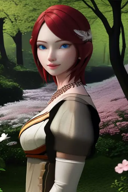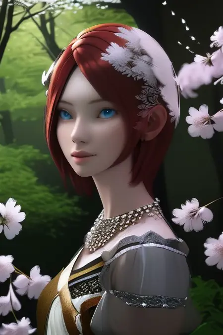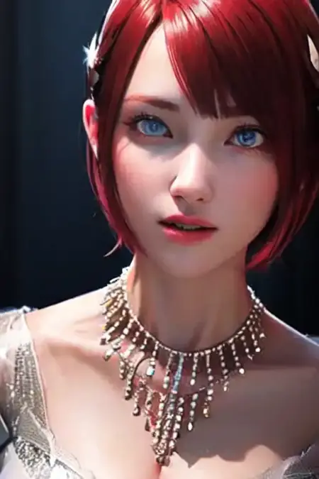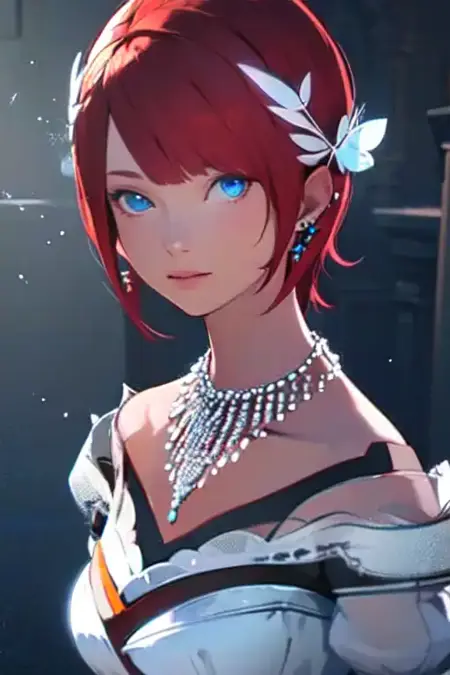 Prompt: Princess Elise, fair skin, short red hair, blue eyes, white dress, silver earrings, a gem necklace, tan pantyhose, red and silver high heels