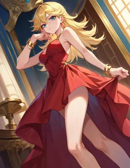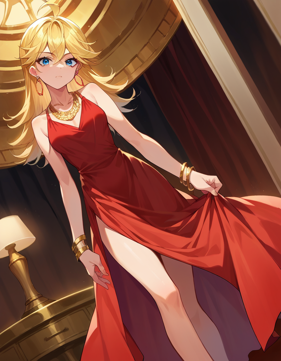 bare legs, bracelet, dress, earrings, gold bracelet, high heels, jewelry, red dress, red footwear,