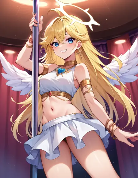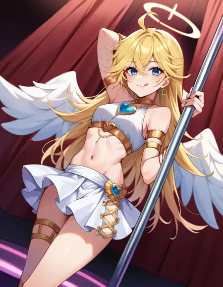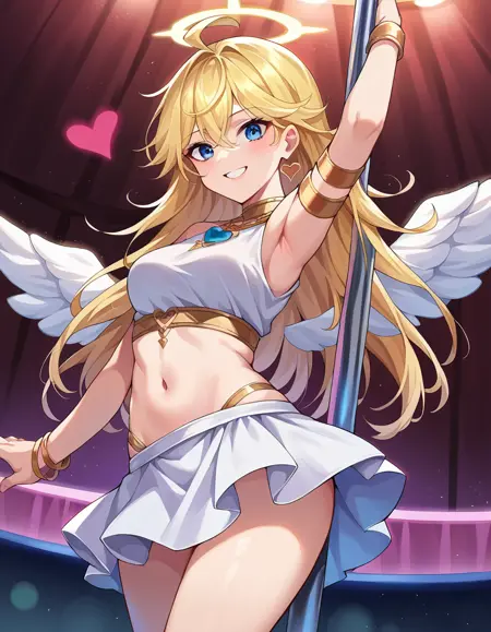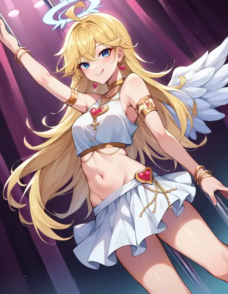 angel, armlet, bracelet, crop top, cross-laced footwear, dress, halo, heart, jewelry, lots of jewelry, midriff, navel, skirt, skirt set, white skirt, wings,