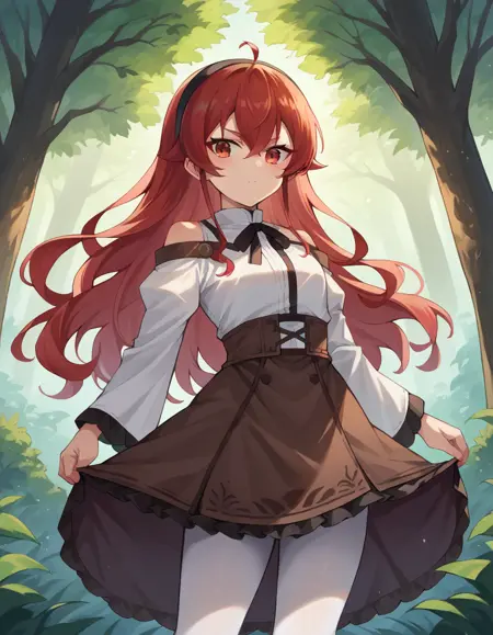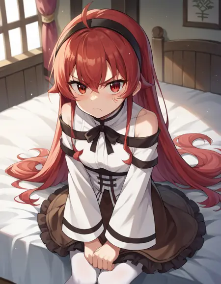 eris greyrat, ahoge, hair between eyes, long hair, red eyes, red hair, sidelocks,