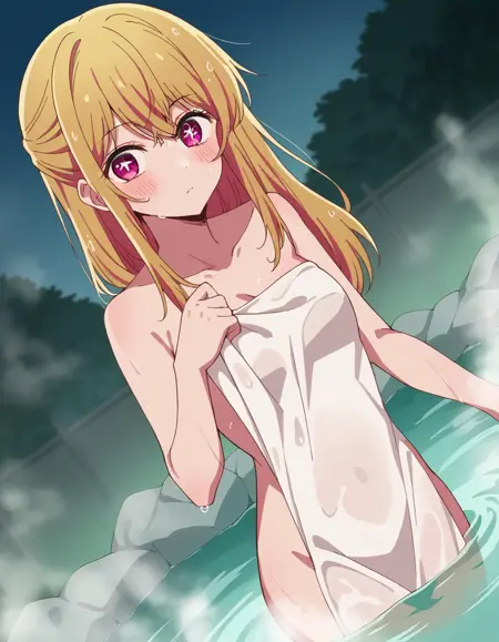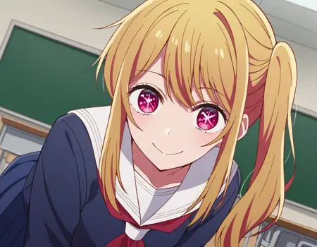 ruby hoshino、長い髪、前髪、金髪、ピンクの目、サイドロックス、シンボル形の瞳、複色の髪、ツートーンの髪、