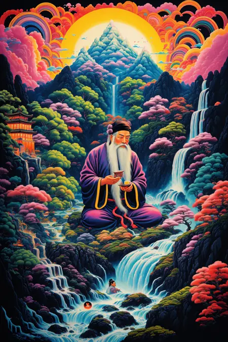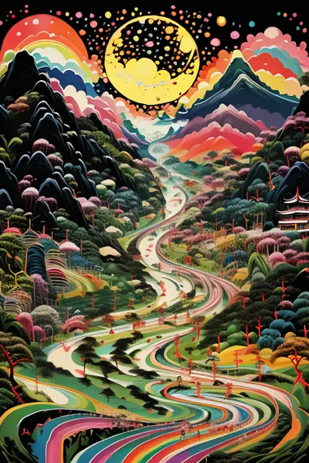 中国风2D插画,炫彩山水,建筑