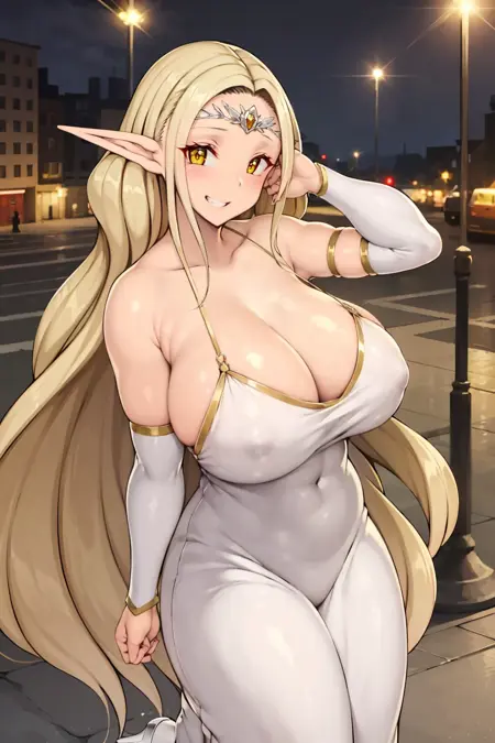 트리거: 마가린, 금발, 매우 긴 머리, 이마, 측면 머리카락, 노란 눈, 흰 동공, 뾰족한 귀, 엘프, 거대한 가슴, 성숙한 여성, 곡선미