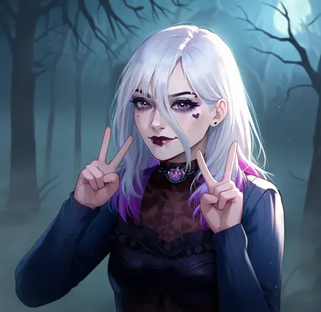 The trigger word is 'Sable Ward' but you can also specify "white hair with purple tips" and "sneakers" and "purple eyes" to ensure all the details are correct.