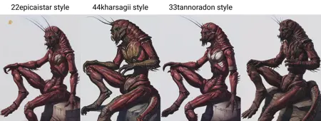我还加入了特殊标签 22epicaistar 风格33tannoradon 风格44kharsagii 风格,这些标签仅会将生成的虾类解剖结构调整为相应艺术家的绘画风格。