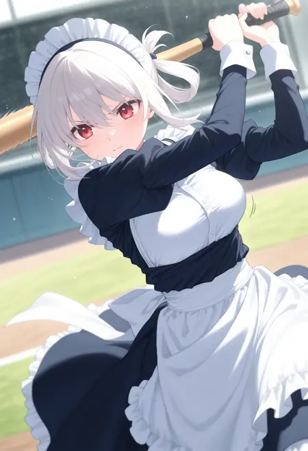 트리거만 사용하면 실내에서 배트를 휘두르게 되므로, baseball bat, baseball, holding baseball bat, motion lines, motion blur, outdoors, baseball stadium 등의 요소를 추가하면 현실감이 더 나아질 수 있습니다.