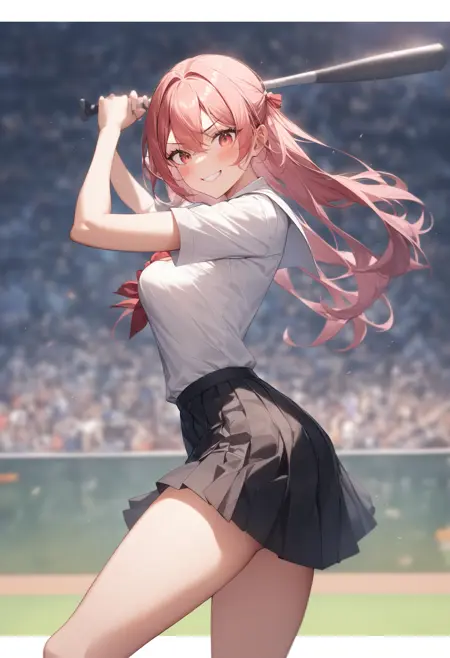 トリガーだけだと室内で振り回したりするので baseball bat, baseball, holding baseball bat, motion lines, motion blur, outdoors, baseball stadium 辺りから必要な物を入れていただくと臨場感出ていいかもしれません。