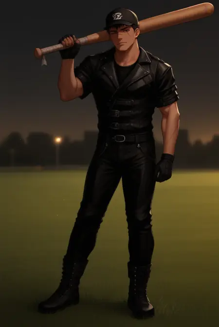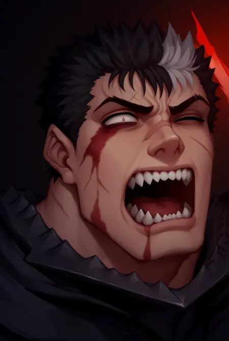 의상 1: ["Guts_Armor, brown eyes, short hair, multicolored hair, spiked hair, scar on nose, black armor, full armor, torn cape, lora:GutsAnimdxlDwnsty:1, one eye closed, muscular male"]