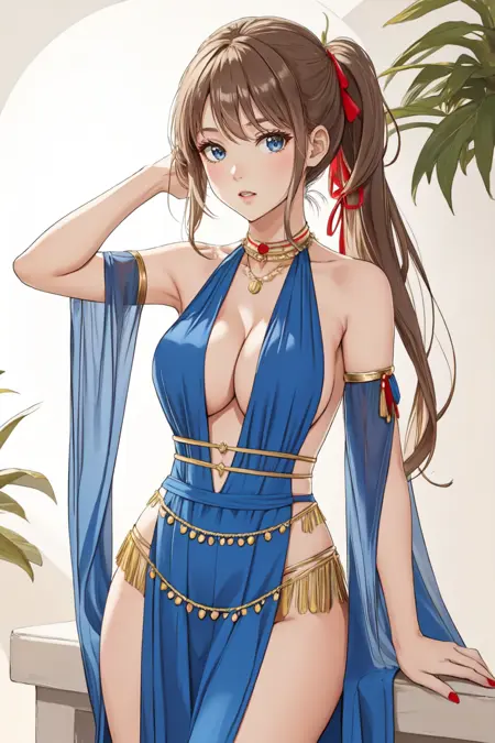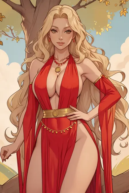 키워드: HUD_Rd_BllyDncr, 빨간 시폰 헬터 드레스, 분리형 소매, 동전 목걸이, 동전 벨트