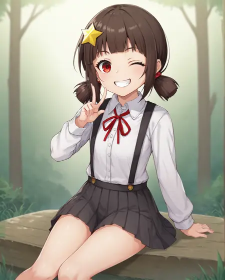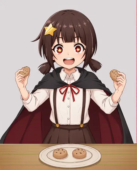 Watch out, the Crimson Demons are a notorious clan of powerful magic casters the likes of which this world can meekly comprehend, and just incase you forgot, (or never watched Konosuba) this is Megumin's little sister Komekko yet another of the Crimson Demon clan, the proof is in her eyes the Crimson color a hue to be feared I tell you... FEARED, so don't let this little gremlin close to your fridge... "Why?" you may be asking, well first of all she's clever, and eternally hungry you might just be out tonight's meal thanks to her ya'know, that's some powerful stuff, and don't you forget it.