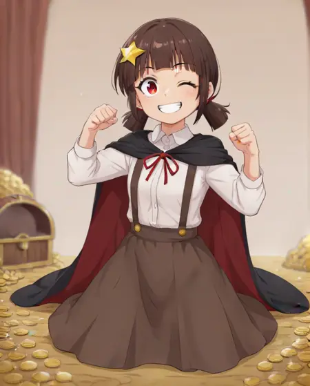 1girl, komekko, star_hair_ornament, red eyes, twintails, brown_hair, blunt_bangs, standing, low ponytail, brown skirt, suspender skirt, collared shirt, cape, skirt