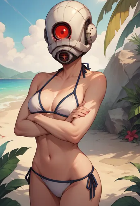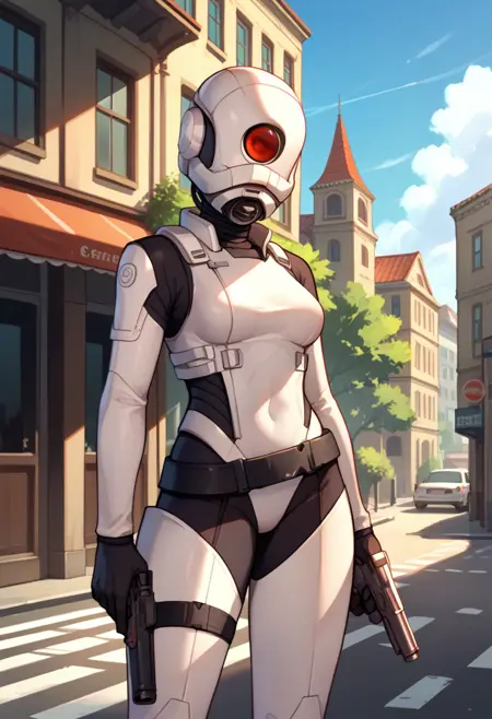 Default Outfit: helmet, red eyes, one-eyed, white bodysuit, black gloves