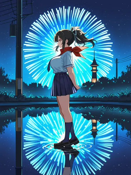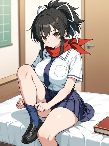 Trigger Words for school outfit are "hanzo_school_clothes, white shirt, short sleeves, blue stripe piping, blue necktie, blue skirt, pleated skirt, blue knee socks, black loafers".