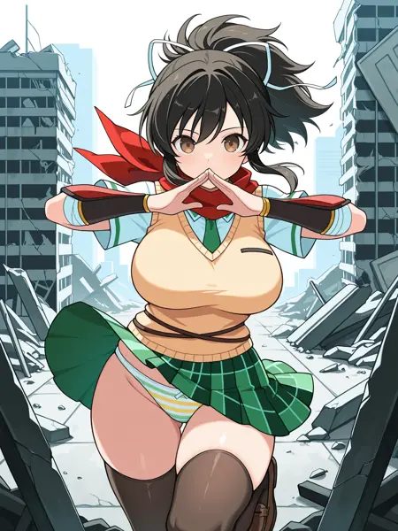 Trigger Words for shinobi outfit are "asuka_shinobi_outfit, beige sweater vest, green necktie under sweater, white shirt with short sleeves, green stripe piping, brown crossed straps, forearm guards, bandages under forearm guards, green plaid skirt, black stockings, brown loafers".