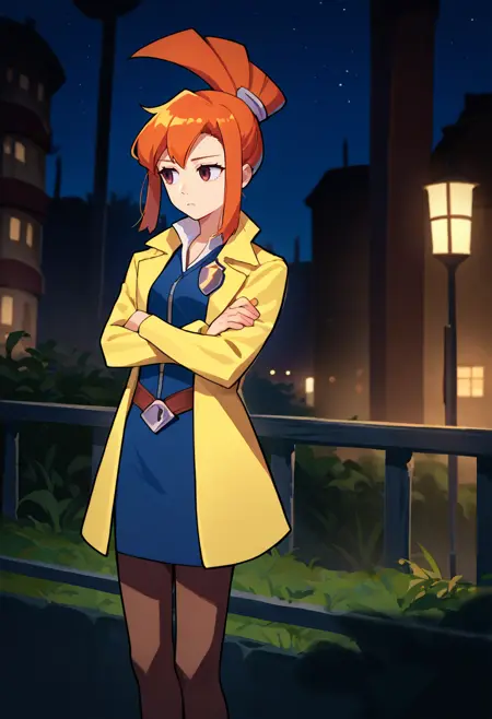 Default Outfit: yellow coat, long sleeves, blue dress, brown pantyhose, badge, belt