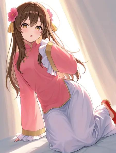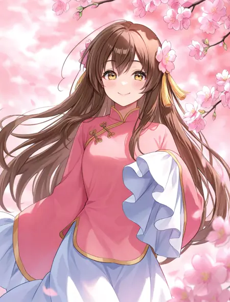 chinese clothes, pink shirt, pink hair flower, white skirt, sleeves past wrists