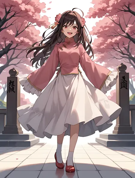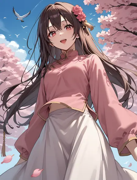 chinese clothes, pink shirt, pink hair flower, white skirt, sleeves past wrists